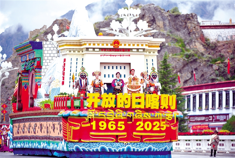 居于方陣中間的七市(地)彩車,各具神韻:拉薩彩車,布達拉宮“之”字形階梯與綠意南北山相映成趣,黑頸鶴展翅,八廓街古今交融,古城活力撲面而來;日喀則彩車以吉隆口岸為車頭,國門前,兩名著定日服飾的地震災區(qū)群眾代表,手捧切瑪,表達對黨中央的深深感恩之情;山南彩車化牛皮筏為“前進中的方舟”,雅江奔流,激蕩千年歷史與今朝活力;林芝彩車讓雅江托起嘎拉村大門,村黨支部書記捧讀總書記回信,感恩與愛戴隨江風遠揚;昌都彩車以紅旗勾勒車體,“西藏第一面五星紅旗升起的地方”紅色印記熠熠生輝;那曲彩車破浪疾行,天下第一道班、青藏鐵路、公路縮影依次呈現(xiàn),盡顯“極地那曲”改革創(chuàng)新的萬丈豪情;阿里彩車如一葉方舟,岡仁波齊與札達土林巍然矗立,獅泉河浪花托起“亞洲水塔”的生態(tài)使命。