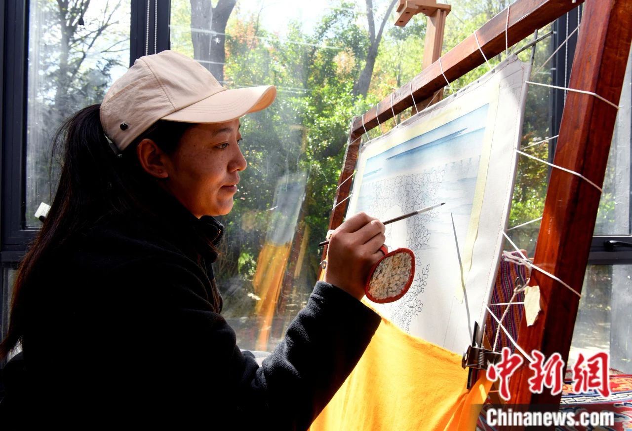 圖為西藏雪堆白技工學(xué)校學(xué)生德慶曲珍正在繪制唐卡。中新社記者 李林 攝