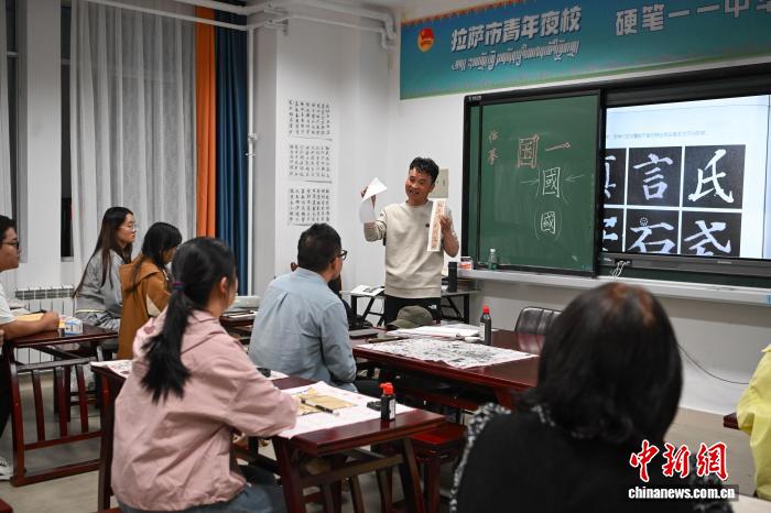 9月1日,2025年西藏自治區(qū)拉薩市第二期“青年夜校”正式開班。圖為夜校學(xué)員在上書法課。中新社記者 貢嘎來松 攝