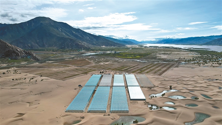 位于扎囊縣的國家農(nóng)業(yè)產(chǎn)業(yè)化示范企業(yè)——西藏綠之源現(xiàn)代農(nóng)業(yè)科技股份有限公司二期項(xiàng)目,如同一片“綠洲”鑲嵌在沙丘之中。記者 丹增平措 攝