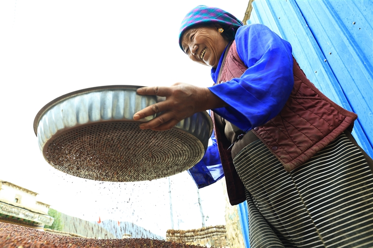 在莫沖村2組村民貢嘎頓玉的家門前,同樣是一派熱鬧的豐收?qǐng)鼍啊X暩骂D玉正和妻子、女兒一起清理剛收獲的菜籽,顆粒飽滿的油菜籽堆成小堆,透著滿滿的幸福感。