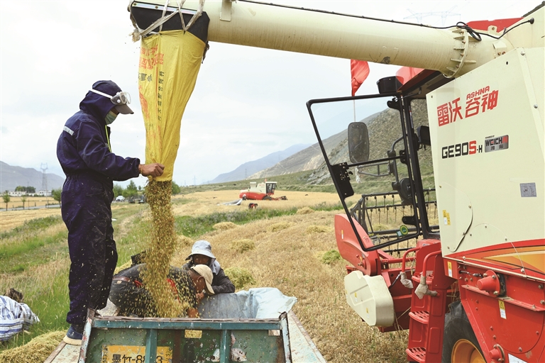 金秋十月,墨竹工卡縣的田野被染成金色,一年一度的秋收大幕正式拉開。田間地頭,大型收割機(jī)穿梭作業(yè),村民們緊隨其后,臉上滿是豐收的喜悅,勾勒出一幅“糧滿倉(cāng)、人歡笑”的美麗秋收畫卷。