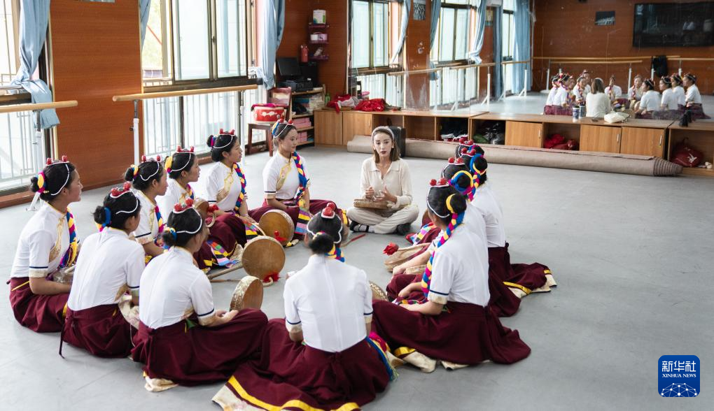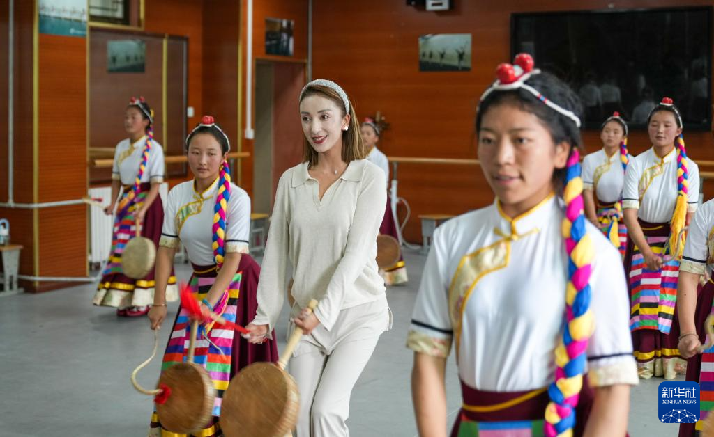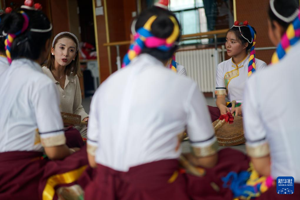 9月9日,在拉薩市第二中等職業(yè)技術(shù)學校,尼瑪卓瑪老師(左三)在指導孩子們舞蹈動作。新華社記者 晉美多吉 攝