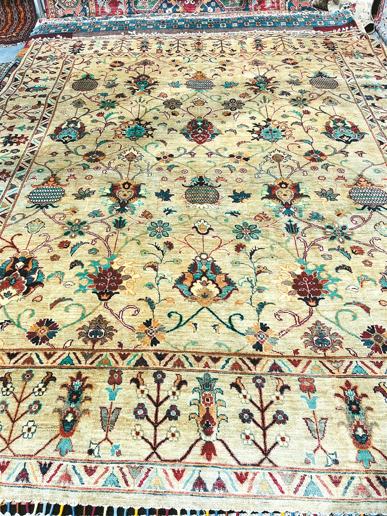 圖為外國商家展示阿富汗手工羊毛地毯。記者 央金 攝