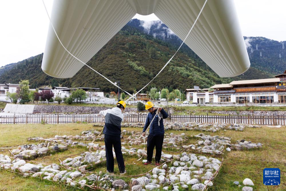 9月18日,“極目一號”浮空艇大氣觀測試驗現場,科研人員在操作輔助系索。新華社記者 金立旺 攝