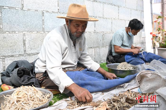 圖為雪拉村村民在給狼毒草根去皮。中新社記者 貢嘎來(lái)松 攝
