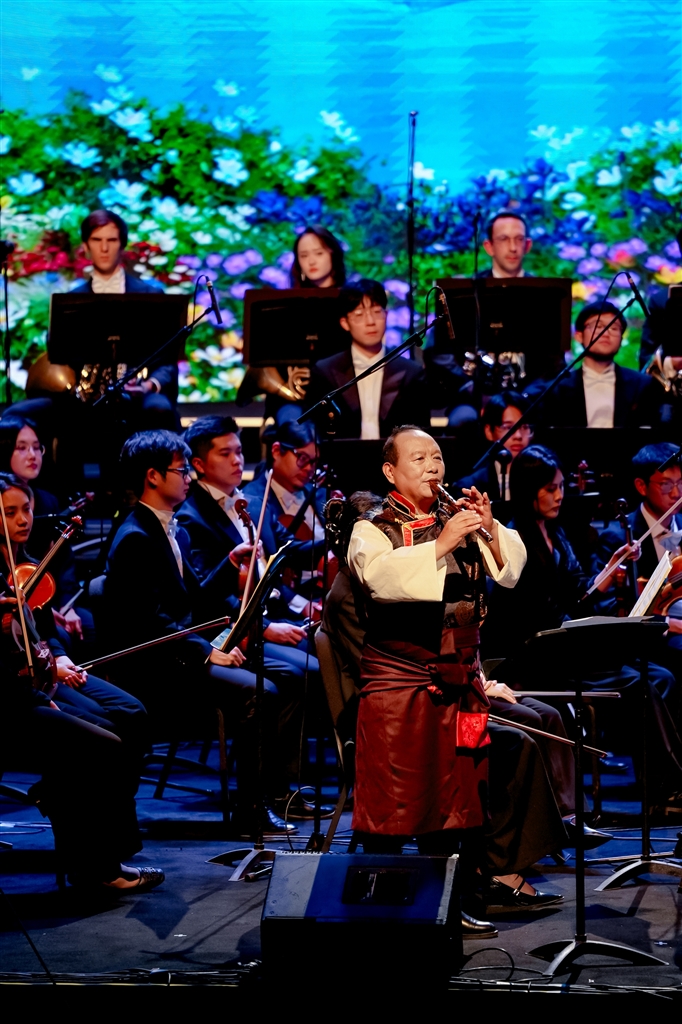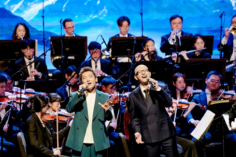 藝術形式的創(chuàng)新融合是本次音樂會的一大亮點。二重唱《茉莉與格?!穬?yōu)美詮釋了民族文化的交流共生;器樂演奏《“飛弦踏春”與“賽馬”》則讓著名二胡演奏家陳軍的激昂琴聲與扎念琴演奏員措姆的熱情彈奏展開對話,碰撞出令人振奮的藝術火花。從展現(xiàn)拉薩當代生活的電視劇插曲《藍天上的云》,到描繪鄉(xiāng)村振興新貌的《童話里的格林村》,再到融合原生態(tài)山歌與專業(yè)唱法、曾為中央代表團獻唱的《珠穆朗瑪》,一系列新創(chuàng)作品生動展現(xiàn)了傳統(tǒng)與現(xiàn)代交織、充滿活力的社會主義新西藏。