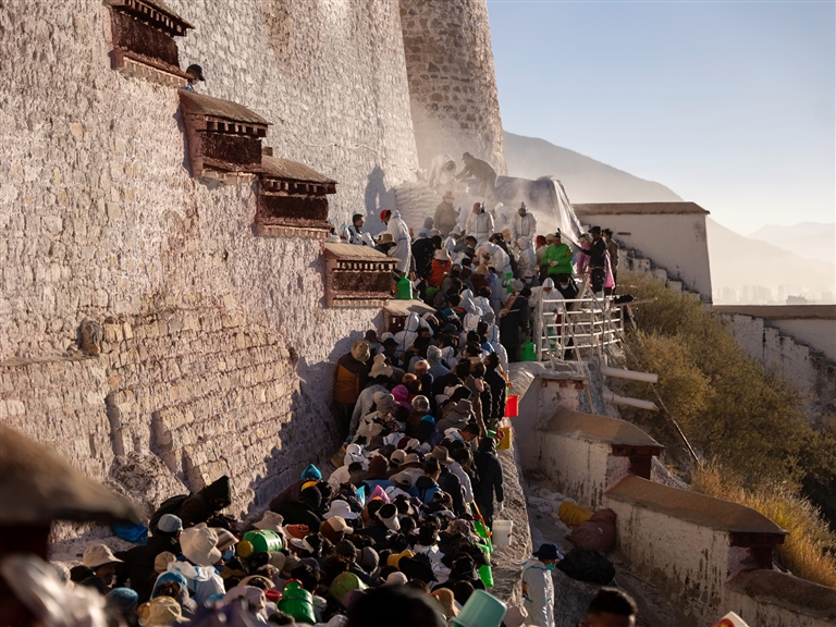 中午時分,溫暖的陽光灑在布達拉宮各個角落,一位穿著藏裝的阿姨一邊喘氣,一邊將手中的奶渣餅分發(fā)給旁邊的人?!敖裉煺媸莻€好日子,這么開心的日子和大家一起勞作,實在讓人難忘?!?/p>