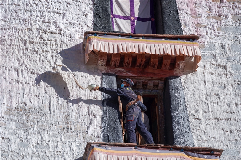 不遠(yuǎn)處,安全繩在布達拉宮白色的墻壁上勾勒出利落的線條。工匠拿著長刷柄和噴槍,正仔細(xì)地粉刷著墻壁的各個角落。陽光刺眼,卻絲毫不影響他們手中利落的動作。