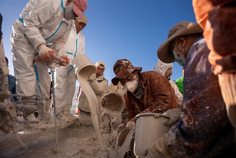宮墻下,人們排隊領(lǐng)取防護服,而后疾步前往涂料攪拌點,生怕去遲了一步,這就是一年一度的布達拉宮粉刷季,現(xiàn)場鮮活又熱鬧。