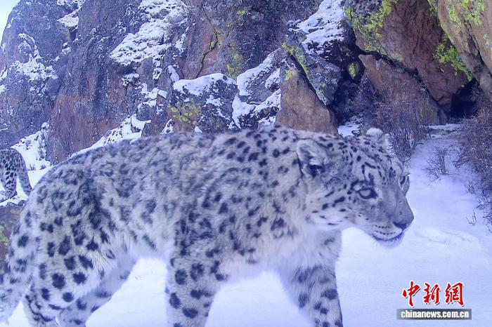 2025年4月13日,西藏拉薩乃朗谷雪豹重要棲息地記錄到雪豹“拉姆”“帶娃”現(xiàn)身于紅外相機(jī)前。(乃朗生態(tài)文化保護(hù)中心供圖)