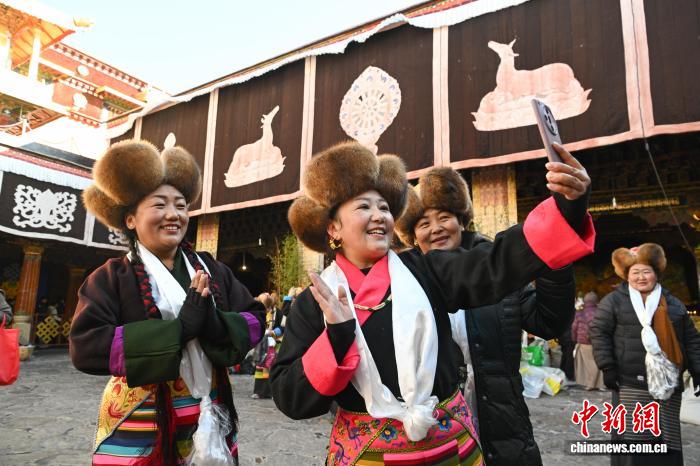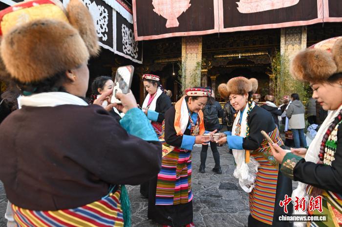 隨著藏歷十月十五白拉姆節(jié)(又稱(chēng)“仙女節(jié)”)臨近,11月28日,西藏拉薩的婦女們?cè)诖笳阉绿陚鹘y(tǒng)舞蹈后自拍留念,迎接“仙女節(jié)”到來(lái)。“仙女節(jié)”即吉祥天母節(jié),藏語(yǔ)稱(chēng)“白來(lái)日追”。相傳藏傳佛教最高護(hù)法神之一班丹拉姆的女兒白拉姆,不顧母親的反對(duì)與赤尊贊私定終身,班丹拉姆一怒之下將赤尊贊趕到拉薩河南岸,規(guī)定二人僅每年的藏歷十月十五日相見(jiàn)。中新社記者 貢嘎來(lái)松 攝