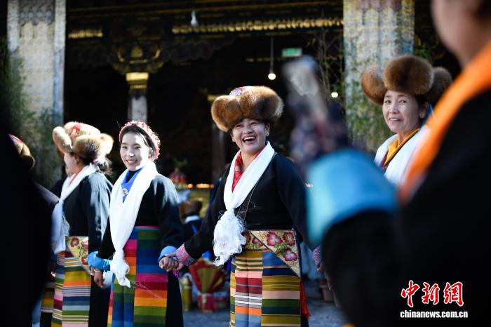隨著藏歷十月十五白拉姆節(jié)(又稱(chēng)“仙女節(jié)”)臨近,11月28日,西藏拉薩的婦女們?cè)诖笳阉绿饌鹘y(tǒng)舞蹈,迎接“仙女節(jié)”到來(lái)。“仙女節(jié)”即吉祥天母節(jié),藏語(yǔ)稱(chēng)“白來(lái)日追”。相傳藏傳佛教最高護(hù)法神之一班丹拉姆的女兒白拉姆,不顧母親的反對(duì)與赤尊贊私定終身,班丹拉姆一怒之下將赤尊贊趕到拉薩河南岸,規(guī)定二人僅每年的藏歷十月十五日相見(jiàn)。中新社記者 貢嘎來(lái)松 攝