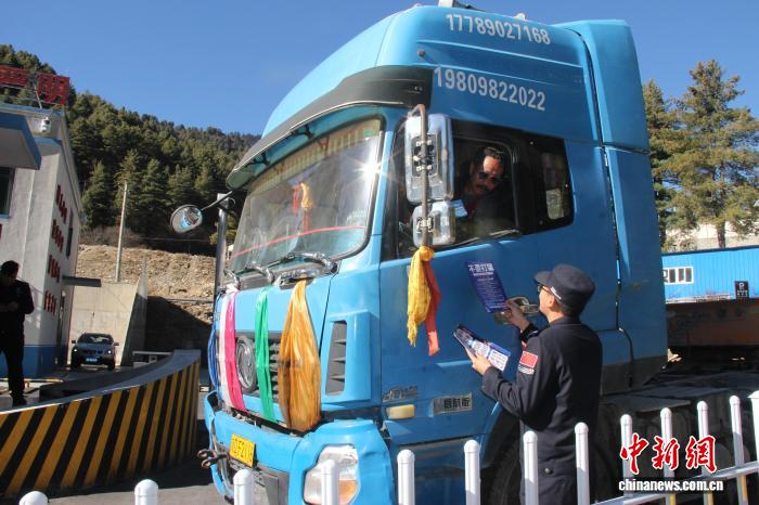 圖為西藏邊檢總站執(zhí)法調(diào)查支隊(duì)民警向過往車輛駕駛員開展宣傳。西藏邊檢總站執(zhí)法調(diào)查支隊(duì)供圖