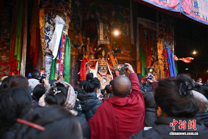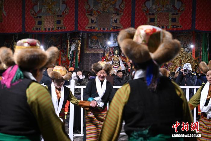 圖為身著民族服裝的信眾在大昭寺內(nèi)載歌載舞。中新社記者 貢嘎來(lái)松 攝