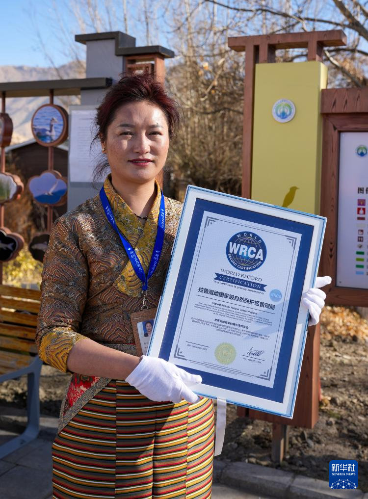 12月20日,拉魯濕地國家級自然保護區(qū)工作人員展示拉魯濕地獲得的“世界海拔最高的城市天然濕地”證書。新華社記者 晉美多吉 攝