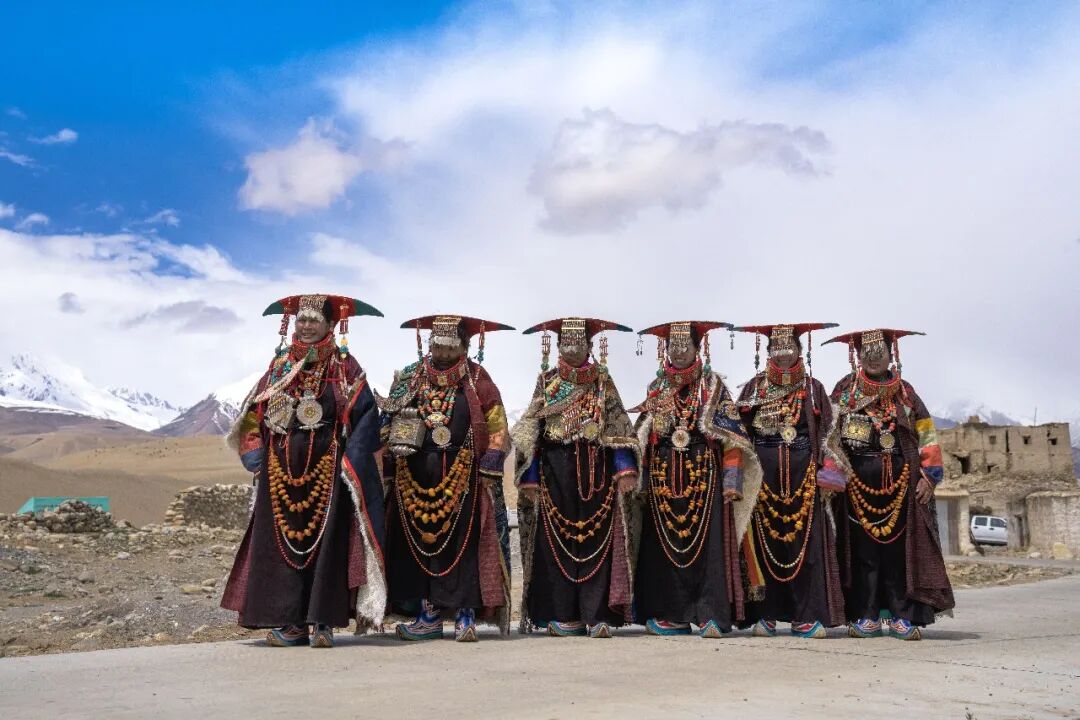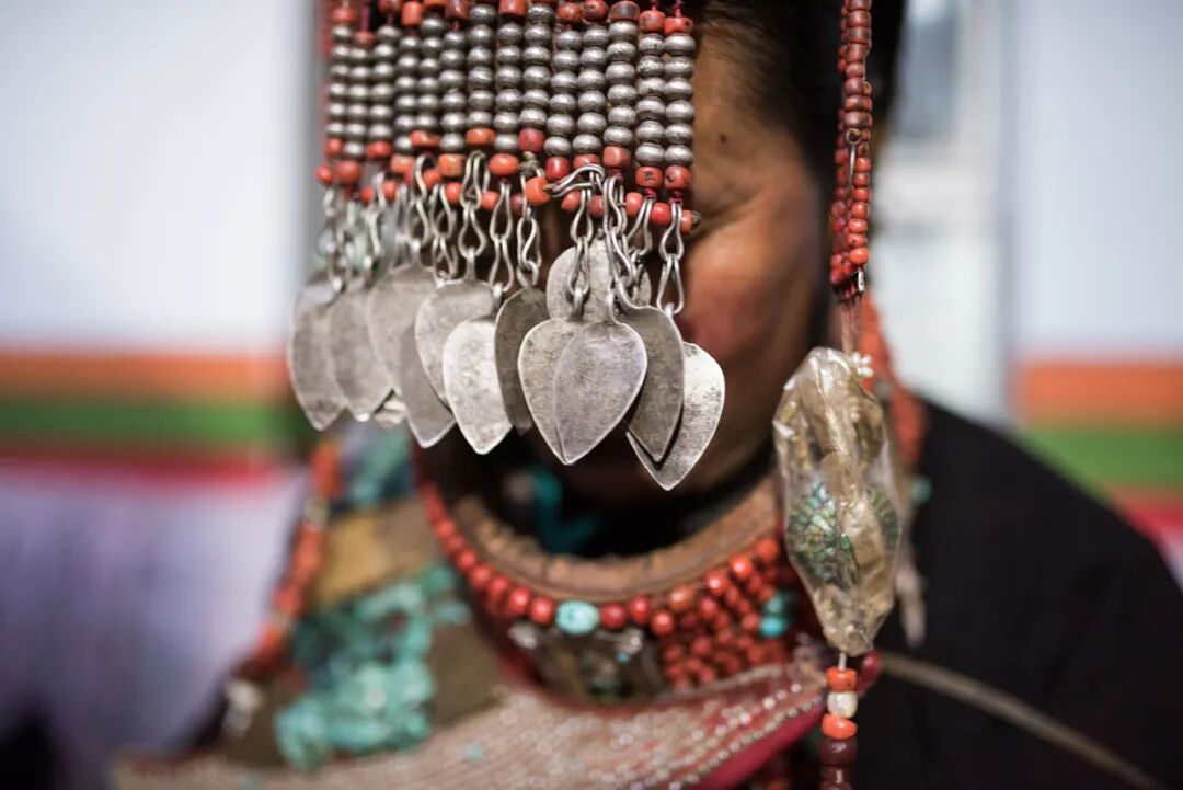 這些服飾上的花紋、顏色和裝飾品都有特定寓意,記錄著普蘭悠久的歷史和與周邊地區(qū)的文化交流,被譽為“穿在身上的史詩”。這套服飾雍容華貴,單是穿戴就要一個多小時。地處貿易要道的普蘭人,將遙遠的珊瑚、黃金、蜜蠟、白銀、綠松石、珍珠全都裝飾在“宣”服上,展示著對這襲錦袍的無比珍視。