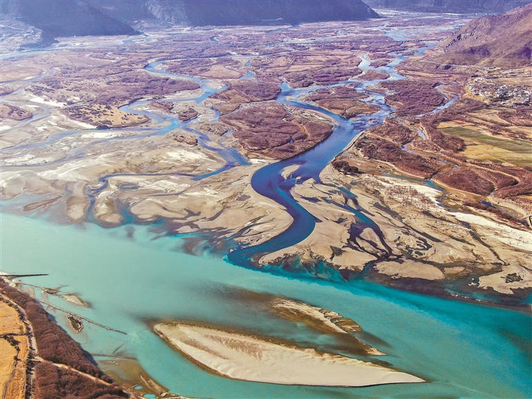 這份動人的景致,是西藏始終堅守生態(tài)保護(hù)的成果。冬季,雅魯藏布江流域降水減少,流速減緩,水體含沙量大幅降低,河床泥沙沉淀,水體澄澈度達(dá)到全年最高,加之礦物質(zhì)與水體交融,高原純凈的空氣讓陽光穿透性更強,江水的色彩層次被放大,造就了這幅江水為墨、沙洲為紙的自然畫卷。