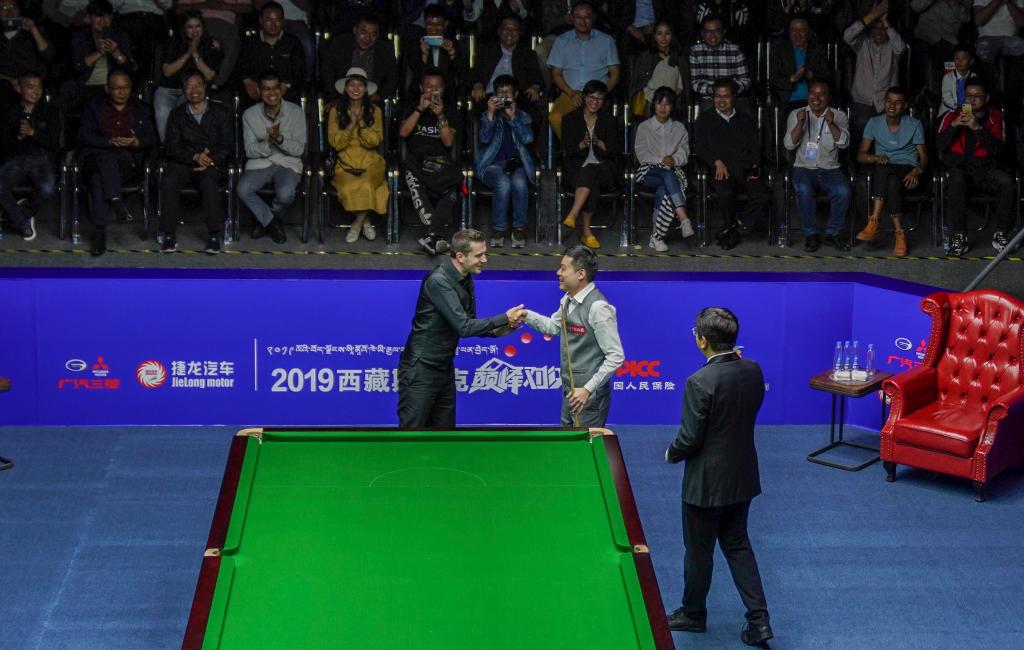 2019西藏斯諾克巔峰對決比賽中,塞爾比(左一)祝賀丁俊暉單桿打出147的滿分。新華社記者 晉美多吉 攝