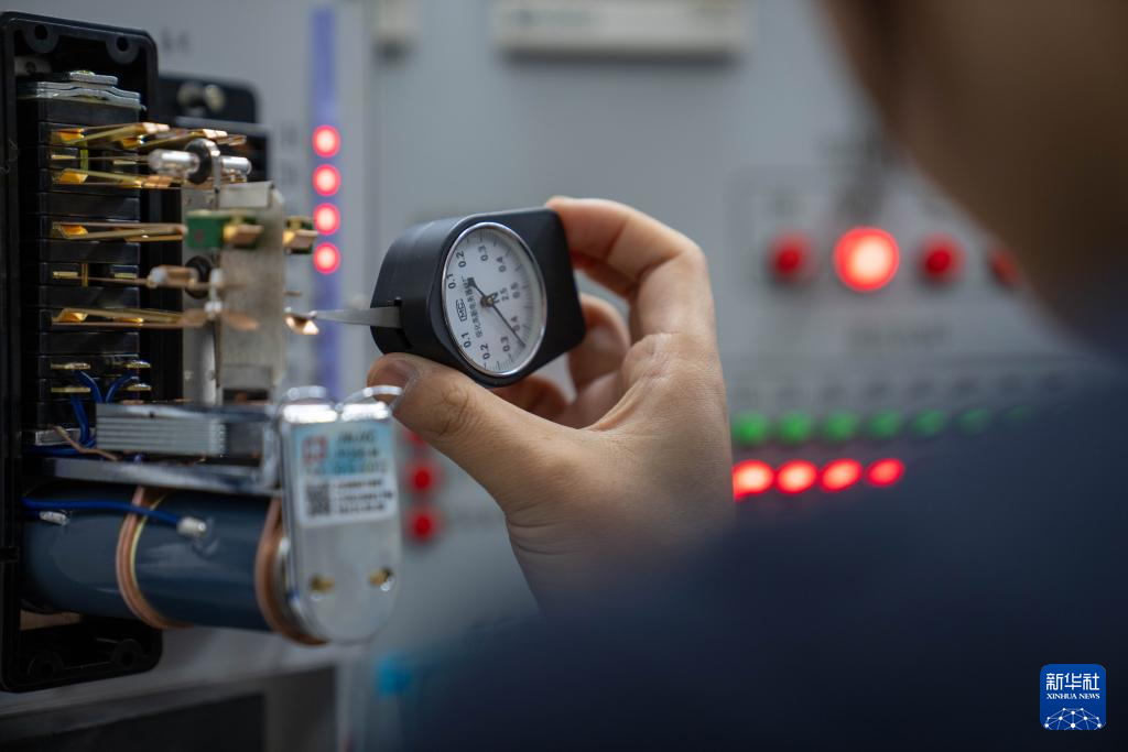 1月6日,拉薩基礎(chǔ)設(shè)施段電務(wù)專修車間繼電器檢修工區(qū)的信號(hào)工丁增央金在測(cè)試?yán)^電器節(jié)點(diǎn)壓力。新華社記者 旦增尼瑪曲珠 攝