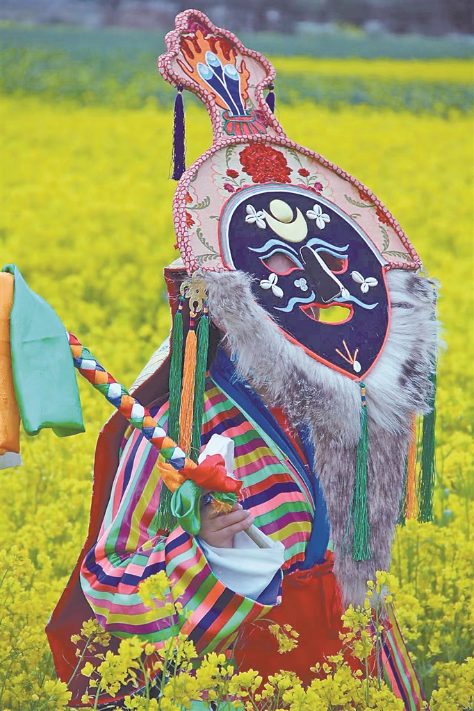 花至少三天時間制作一個大的藍面具,用一周左右制作一套藏戲服裝……在米瑪堅才手里,一抹抹絢麗的色彩渲染著角色的命運,一道道清晰的刻痕勾勒出故事的輪廓。