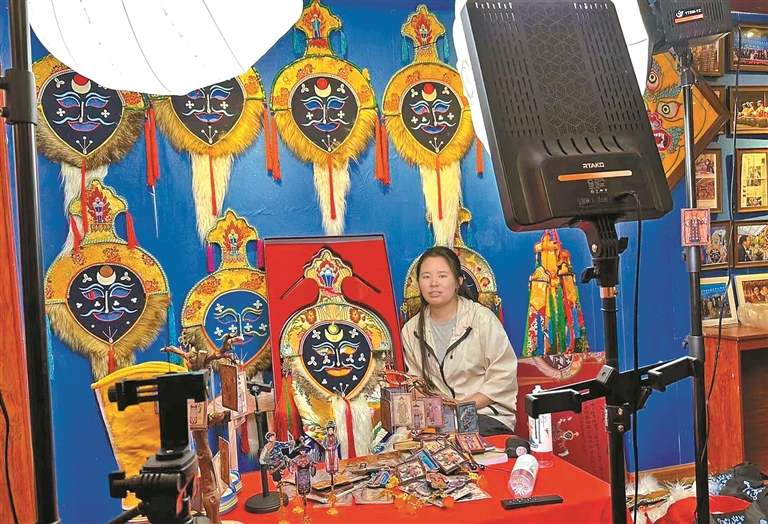 達孜區(qū)雪鄉(xiāng)阿古傳統(tǒng)藏戲服飾農(nóng)牧民專業(yè)合作社員工通過網(wǎng)絡直播,拓寬藏戲服飾銷售渠道。