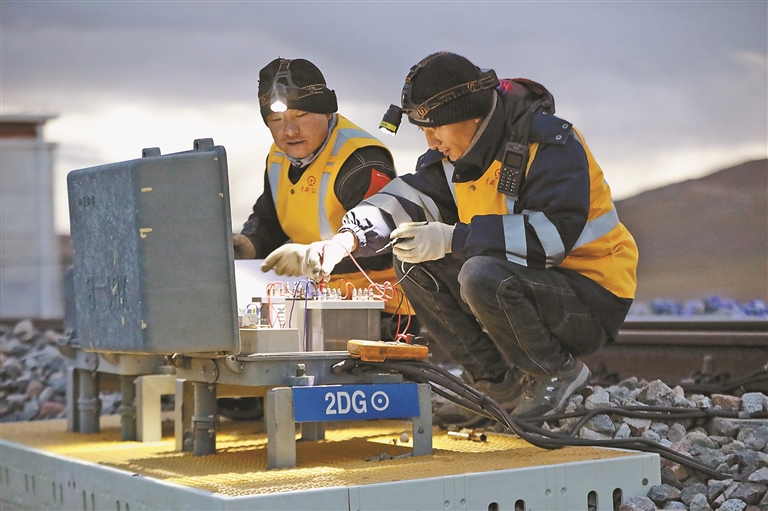 圖為近日,中國(guó)鐵路青藏集團(tuán)有限公司拉薩基礎(chǔ)設(shè)施段那曲信號(hào)車(chē)間扎加藏布信號(hào)工區(qū)職工在對(duì)信號(hào)機(jī)進(jìn)行電氣特性測(cè)試及數(shù)據(jù)記錄。記者 旦增蘭澤 通訊員 拉巴次仁 攝