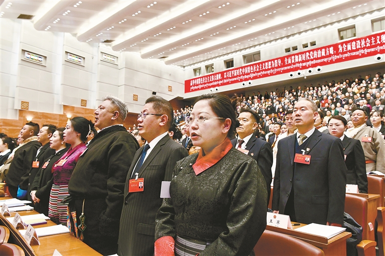 人大代表們神情莊重,齊聲高唱國歌。記者 旦增蘭澤 攝
