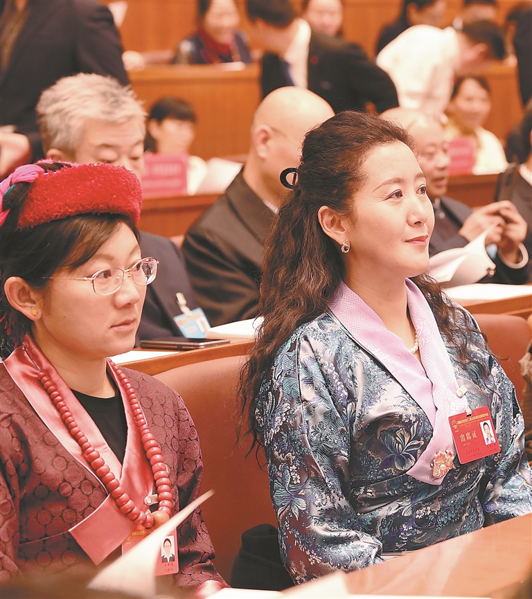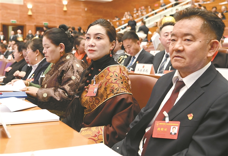 人大代表們認真聆聽政府工作報告。記者 洛桑 攝