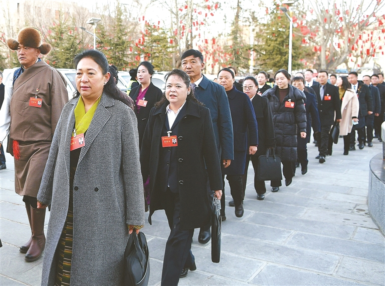 人大代表們精神飽滿、意氣風發(fā)地步入會場。記者 洛桑 攝