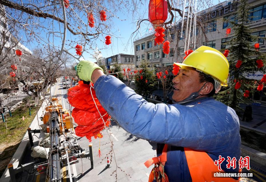2月3日,西藏拉薩,工人沙吉頓珠正在掛燈籠。隨著春節(jié)、藏歷新年的臨近,拉薩城區(qū)大街小巷被精心裝點(diǎn),年味愈發(fā)濃郁。中新社記者 李林 攝
