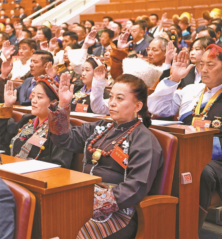 人大代表們舉手表決各項(xiàng)決議草案。記者 洛桑 攝