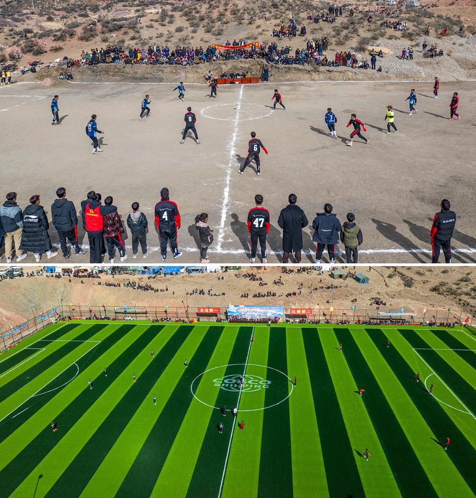 拼版照片:上圖為球員在馬利鎮(zhèn)馬利村“爸爸修的足球場”上比賽(2024年1月21日攝)。新華社記者 孫非 攝;下圖為球員在馬利鎮(zhèn)“云上球場”比賽(2025年1月2日攝)。新華社記者 丁增尼達(dá) 攝