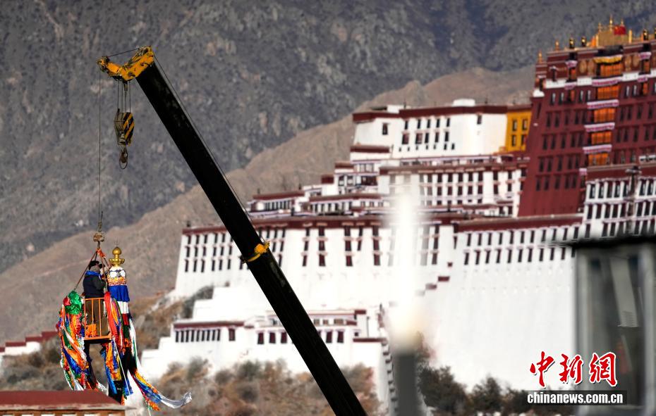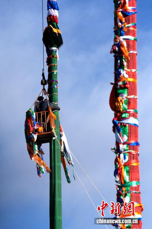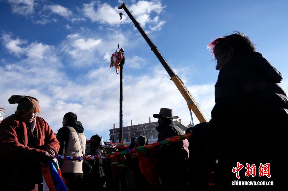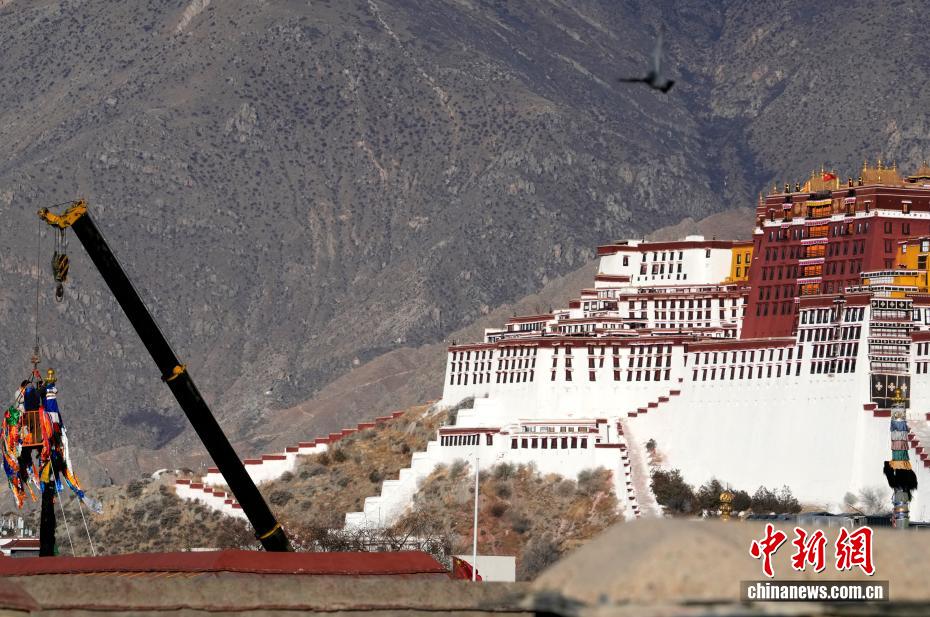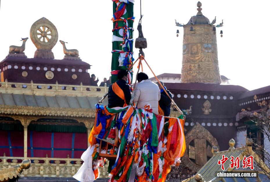 2月5日,西藏拉薩大昭寺的工作人員依據(jù)傳統(tǒng)為大昭寺周邊的5根高20多米的經(jīng)幡柱更換經(jīng)幡,迎接即將到來的藏歷新年。圖為工作人員乘坐吊車更換經(jīng)幡柱上的經(jīng)幡。中新社記者 李林 攝