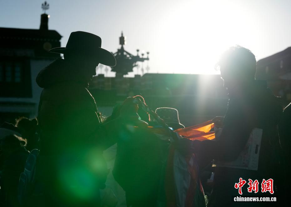 2月5日,西藏拉薩大昭寺的工作人員依據(jù)傳統(tǒng)為大昭寺周邊的5根高20多米的經(jīng)幡柱更換經(jīng)幡,迎接即將到來的藏歷新年。圖為信眾準備五色哈達敬獻給經(jīng)幡柱。中新社記者 李林 攝