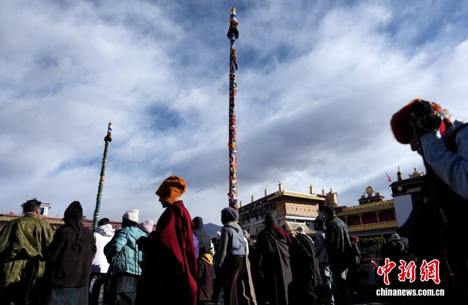 2月5日,西藏拉薩大昭寺的工作人員依據(jù)傳統(tǒng)為大昭寺周邊的5根高20多米的經(jīng)幡柱更換經(jīng)幡,迎接即將到來的藏歷新年。圖為更換經(jīng)幡儀式結(jié)束后,嶄新的經(jīng)幡柱屹立在大昭寺廣場。中新社記者 李林 攝