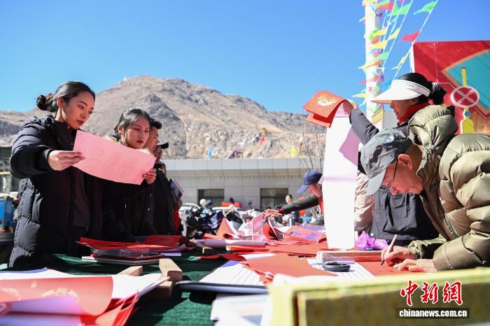 圖為書法家免費(fèi)給村民寫對聯(lián)。中新社記者 貢嘎來松 攝