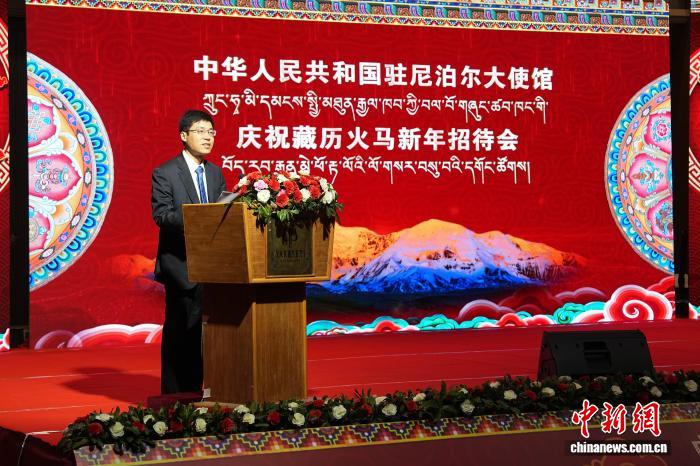 2026年2月7日,中國駐尼泊爾大使館在尼首都加德滿都舉辦藏歷火馬新年招待會,駐尼使館臨時代辦周攀在招待會上致辭。中新社記者 崔楠 攝