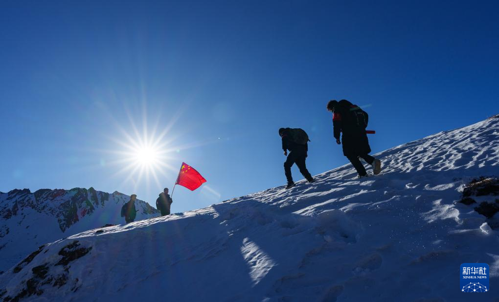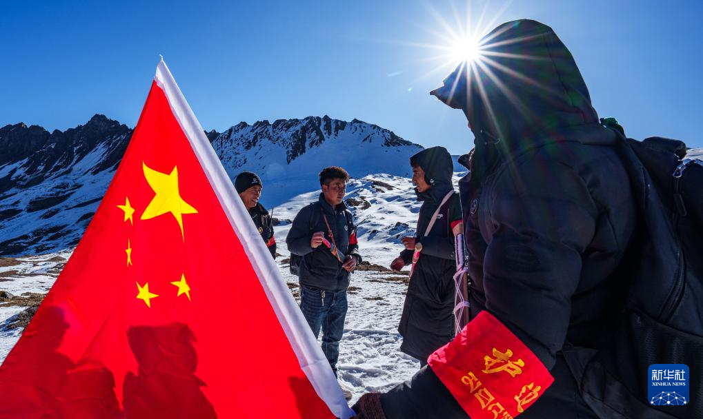 冬日時節(jié),西藏山南市隆子縣玉麥鄉(xiāng)的群山覆蓋著積雪。4名護邊員晨光中行進在雪山間,50歲的普布羅布肩扛國旗,走在隊伍最前面,索朗多吉、拉巴次仁、洛桑羅布緊跟其后。