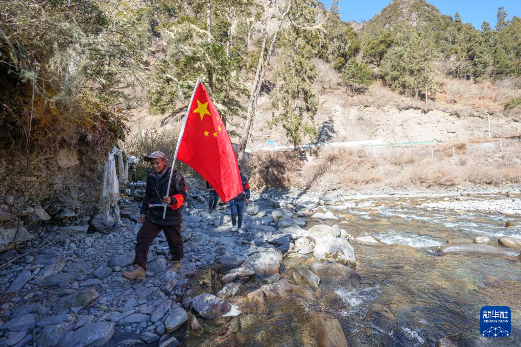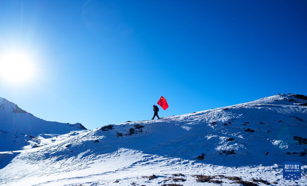 在西藏山南市隆子縣玉麥鄉(xiāng)境內(nèi),護邊員普布羅布扛著國旗行走在雪坡上(2月6日攝)。新華社記者 丁增尼達(dá) 攝