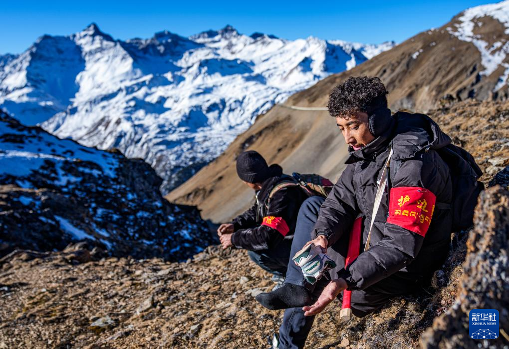 在西藏山南市隆子縣玉麥鄉(xiāng)境內(nèi),護邊員拉巴次仁(右)在清理灌進鞋里的沙石和積雪(2月6日攝)。新華社記者 丁增尼達(dá) 攝