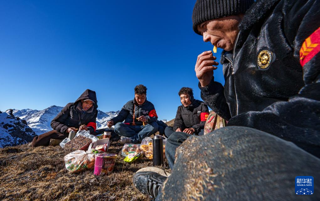 2月6日,在西藏山南市隆子縣玉麥鄉(xiāng)境內(nèi),護邊員們在巡邏途中吃午飯。他們圍坐在一片平坦草地,從背包里掏出糌粑、卡塞(一種傳統(tǒng)油炸面食),再喝幾口酥油茶,這就是巡邏護邊途中一頓簡單的午餐。新華社記者 丁增尼達(dá) 攝
