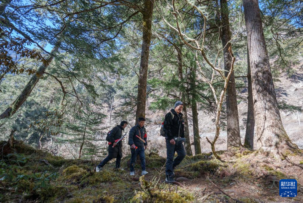 在西藏山南市隆子縣玉麥鄉(xiāng)境內(nèi),護邊員們在叢林里巡邏(2月6日攝)。午飯過后,護邊員們從雪線一路往下繼續(xù)巡邏,海拔越來越低,樹林也越來越密。茂密的藤蔓灌木有時會把人完全遮住。護邊員們抽出腰間砍刀,一刀刀劈開攔路枝杈,踏出一條小徑。新華社記者 丁增尼達(dá) 攝