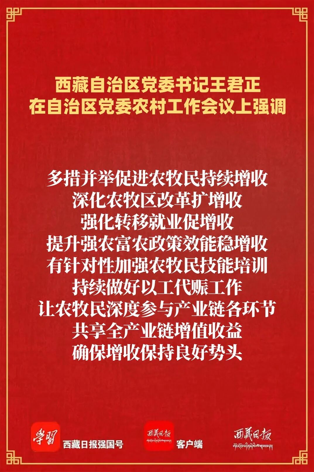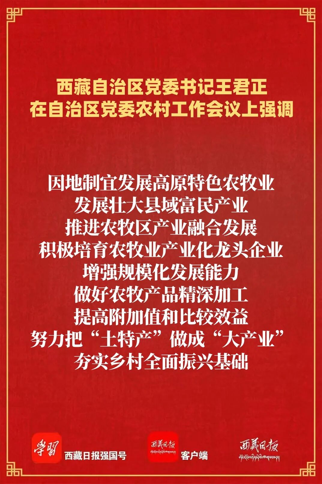 王君正強(qiáng)調(diào),要錨定目標(biāo)任務(wù),突出工作重點(diǎn),努力開創(chuàng)我區(qū)農(nóng)業(yè)農(nóng)村現(xiàn)代化、鄉(xiāng)村全面振興新局面。高度重視“三農(nóng)”工作,深刻認(rèn)識(shí)做好“三農(nóng)”工作是全面建設(shè)社會(huì)主義現(xiàn)代化新西藏、持續(xù)抓好“四件大事”落實(shí)、鞏固黨在西藏的執(zhí)政根基的必然要求,大力支持“三農(nóng)”工作,努力實(shí)現(xiàn)全區(qū)農(nóng)業(yè)基礎(chǔ)更加穩(wěn)固、農(nóng)村地區(qū)更加繁榮、農(nóng)民生活更加紅火。多措并舉促進(jìn)農(nóng)牧民持續(xù)增收,深化農(nóng)牧區(qū)改革擴(kuò)增收,強(qiáng)化轉(zhuǎn)移就業(yè)促增收,提升強(qiáng)農(nóng)富農(nóng)政策效能穩(wěn)增收,有針對(duì)性加強(qiáng)農(nóng)牧民技能培訓(xùn),持續(xù)做好以工代賑工作,讓農(nóng)牧民深度參與產(chǎn)業(yè)鏈各環(huán)節(jié),共享全產(chǎn)業(yè)鏈增值收益,確保增收保持良好勢(shì)頭。大力實(shí)施常態(tài)化精準(zhǔn)幫扶,及時(shí)精準(zhǔn)做好監(jiān)測(cè)識(shí)別,分類做好常態(tài)化幫扶,筑牢兜底保障防線,堅(jiān)持把產(chǎn)業(yè)幫扶作為根本措施,優(yōu)化產(chǎn)業(yè)幫扶方式,不斷提升幫扶實(shí)效,確保不發(fā)生規(guī)模性返貧致貧。著力提升糧食和重要農(nóng)產(chǎn)品產(chǎn)能,毫不放松抓好糧食特別是青稞生產(chǎn),加強(qiáng)耕地保護(hù)和高標(biāo)準(zhǔn)農(nóng)田建設(shè),加強(qiáng)畜牧業(yè)和“菜籃子”產(chǎn)品生產(chǎn)供給,強(qiáng)化農(nóng)牧業(yè)科技賦能,加大氣象監(jiān)測(cè)預(yù)報(bào)預(yù)警力度,增強(qiáng)農(nóng)牧業(yè)防災(zāi)減災(zāi)能力。因地制宜發(fā)展高原特色農(nóng)牧業(yè),發(fā)展壯大縣域富民產(chǎn)業(yè),推進(jìn)農(nóng)牧區(qū)產(chǎn)業(yè)融合發(fā)展,積極培育農(nóng)牧業(yè)產(chǎn)業(yè)化龍頭企業(yè),增強(qiáng)規(guī)模化發(fā)展能力,做好農(nóng)牧產(chǎn)品精深加工,提高附加值和比較效益,努力把“土特產(chǎn)”做成“大產(chǎn)業(yè)”,夯實(shí)鄉(xiāng)村全面振興基礎(chǔ)。加快推進(jìn)高原和美鄉(xiāng)村建設(shè),深入學(xué)習(xí)運(yùn)用“千萬工程”經(jīng)驗(yàn),加快農(nóng)牧區(qū)基礎(chǔ)設(shè)施建設(shè),提高教育、醫(yī)療、社保等公共服務(wù)水平,持續(xù)整治提升農(nóng)牧區(qū)人居環(huán)境,把農(nóng)牧區(qū)建設(shè)得更加宜居宜業(yè)。提高鄉(xiāng)村治理水平,持續(xù)加強(qiáng)黨建引領(lǐng),充分發(fā)揮基層黨組織戰(zhàn)斗堡壘作用,深化文明鄉(xiāng)風(fēng)建設(shè),推動(dòng)形成向上向善的鄉(xiāng)村道德風(fēng)尚;堅(jiān)持和發(fā)展新時(shí)代“楓橋經(jīng)驗(yàn)”,不斷提升基層治理體系和治理能力現(xiàn)代化水平,確保農(nóng)牧區(qū)持續(xù)和諧穩(wěn)定。