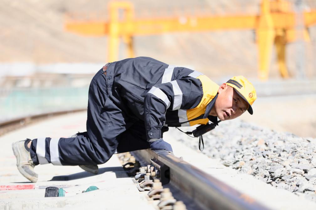 2月11日,日喀則線路工區(qū)工長(zhǎng)索朗多布杰正在檢查鋼軌。(拉巴次仁 攝)