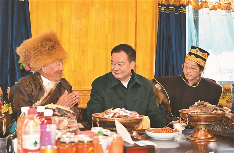 中華民族傳統(tǒng)節(jié)日春節(jié)剛過,雪域高原又迎來了藏歷新年初二,家家戶戶回蕩著“羅薩扎西德勒”的溫馨祝福?!斑^年了,祝你們新年快樂、身體健康、吉祥如意!”王君正走進魯朗鎮(zhèn)扎西崗村77歲的老黨員、致富帶頭人平措家里,嶄新的香布、整潔的小院,切瑪斑斕、卡塞飄香,家里充滿濃濃的年味兒?!吧眢w怎么樣?”“民宿生意好不好?”在暖意融融的客廳里,王君正和老人聊家常,詢問身體狀況及家庭收入等情況,隨后走進平措家的民宿旅館,從價格、住宿條件到屋外山景,看得仔細、問得深入。了解到在以習近平同志為核心的黨中央親切關(guān)懷下,扎西崗村發(fā)生了翻天覆地的變化,平措一家借助本地旅游資源,開民宿、做餐飲,年收入不斷增加,日子越過越好,王君正為他們的發(fā)展感到由衷高興、為他們的幸福生活點贊。他說,“看著北斗星走不迷路、跟著共產(chǎn)黨走會幸福”,這些好日子,離不開以習近平同志為核心的黨中央對西藏工作的高度重視、對西藏各族人民的深切關(guān)懷,大家要感恩總書記、感謝黨中央,更加堅定不移聽黨話、感黨恩、跟黨走;黨員要發(fā)揮先鋒模范作用,發(fā)揚黨的光榮傳統(tǒng)和優(yōu)良作風,帶領(lǐng)村民用勤勞的雙手把家園建設得更加美好,把日子過得更加甜蜜。