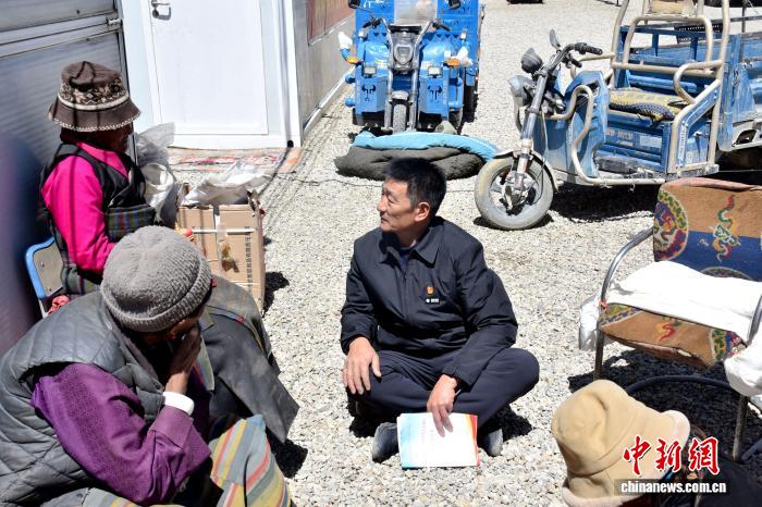 2025年3月21日,扎西尼瑪在日喀則市定日縣長(zhǎng)所鄉(xiāng)安置點(diǎn)向受災(zāi)群眾宣講兩會(huì)精神。(資料圖) 拉薩供電公司 供圖