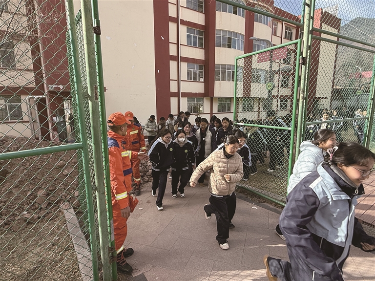 指戰(zhàn)員現(xiàn)場組織開展地震應(yīng)急疏散演練。圖由卡若區(qū)消防救援機(jī)動大隊(duì)提供