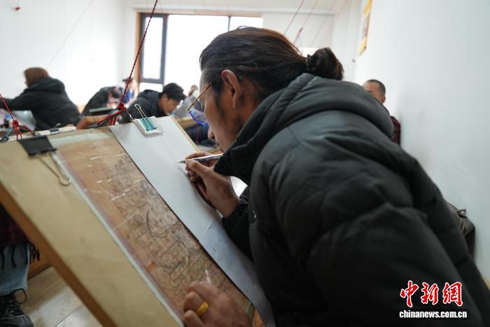 圖為畫室內(nèi)學(xué)徒練習(xí)繪畫唐卡。貢確 攝