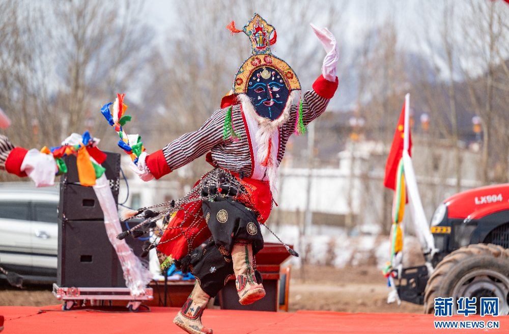 3月16日,西藏拉薩市林周縣春堆鄉(xiāng)春堆村村文藝隊在春耕儀式上表演藏戲。新華網(wǎng) 旦增努布 攝